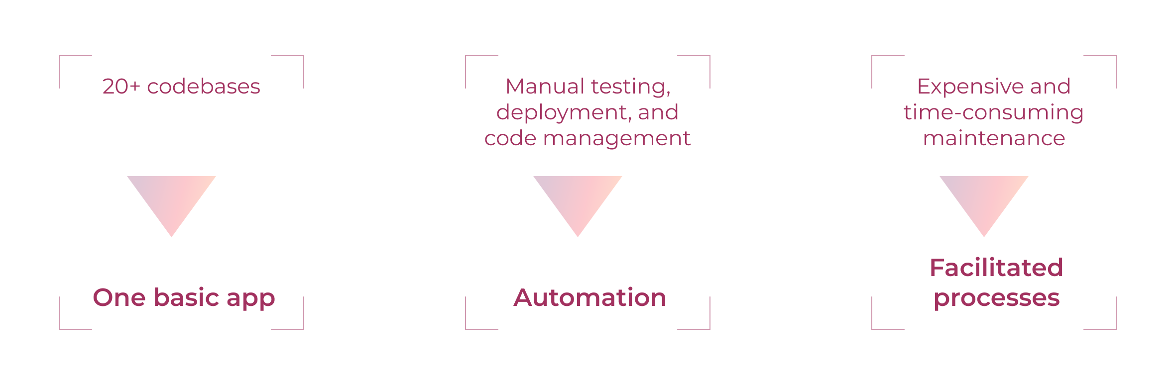 - Instead of 20+ codebases of clients’ apps that all included 80-95% duplicated functionality in different databases, we introduced one basic app template with support for onboarding new customers.